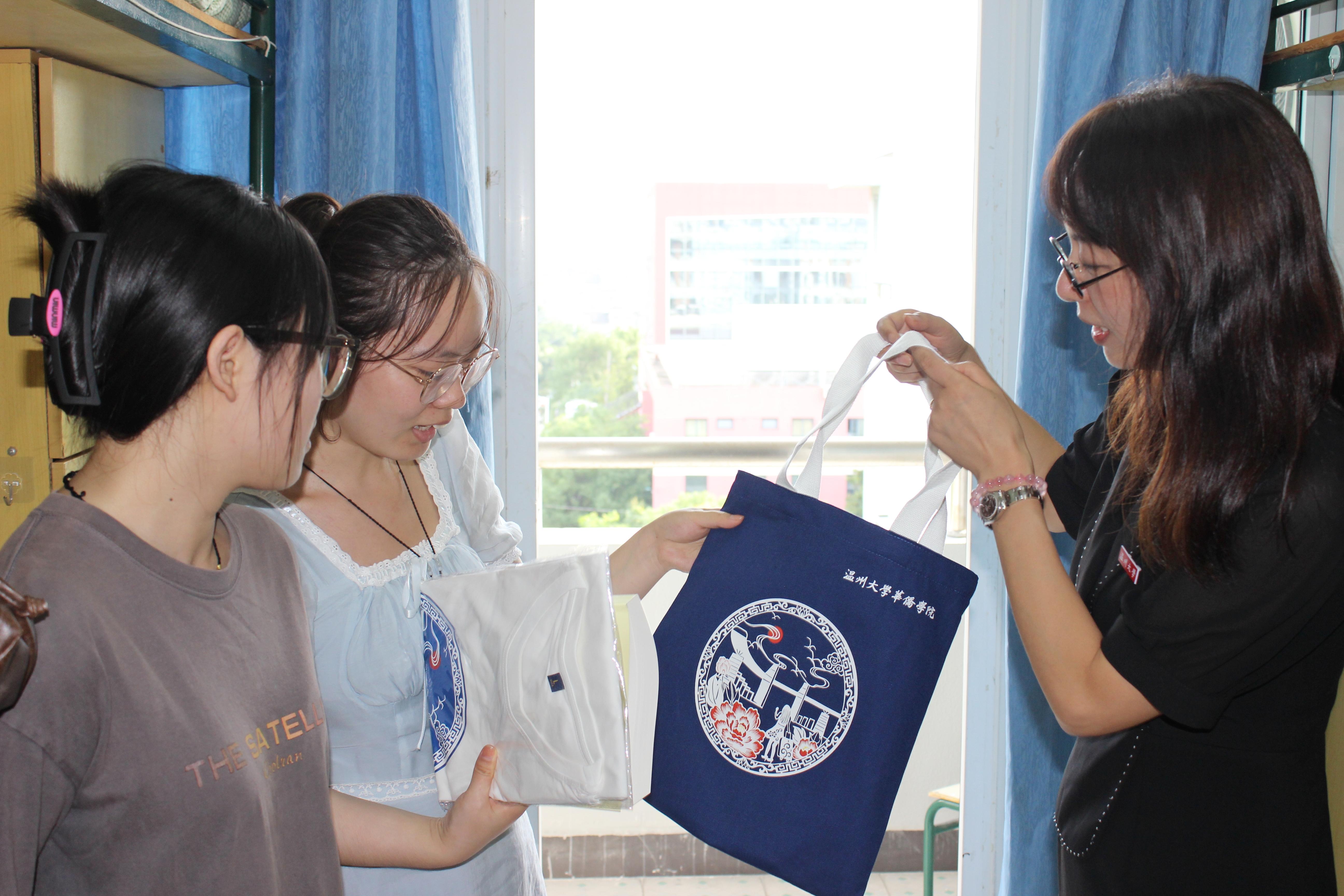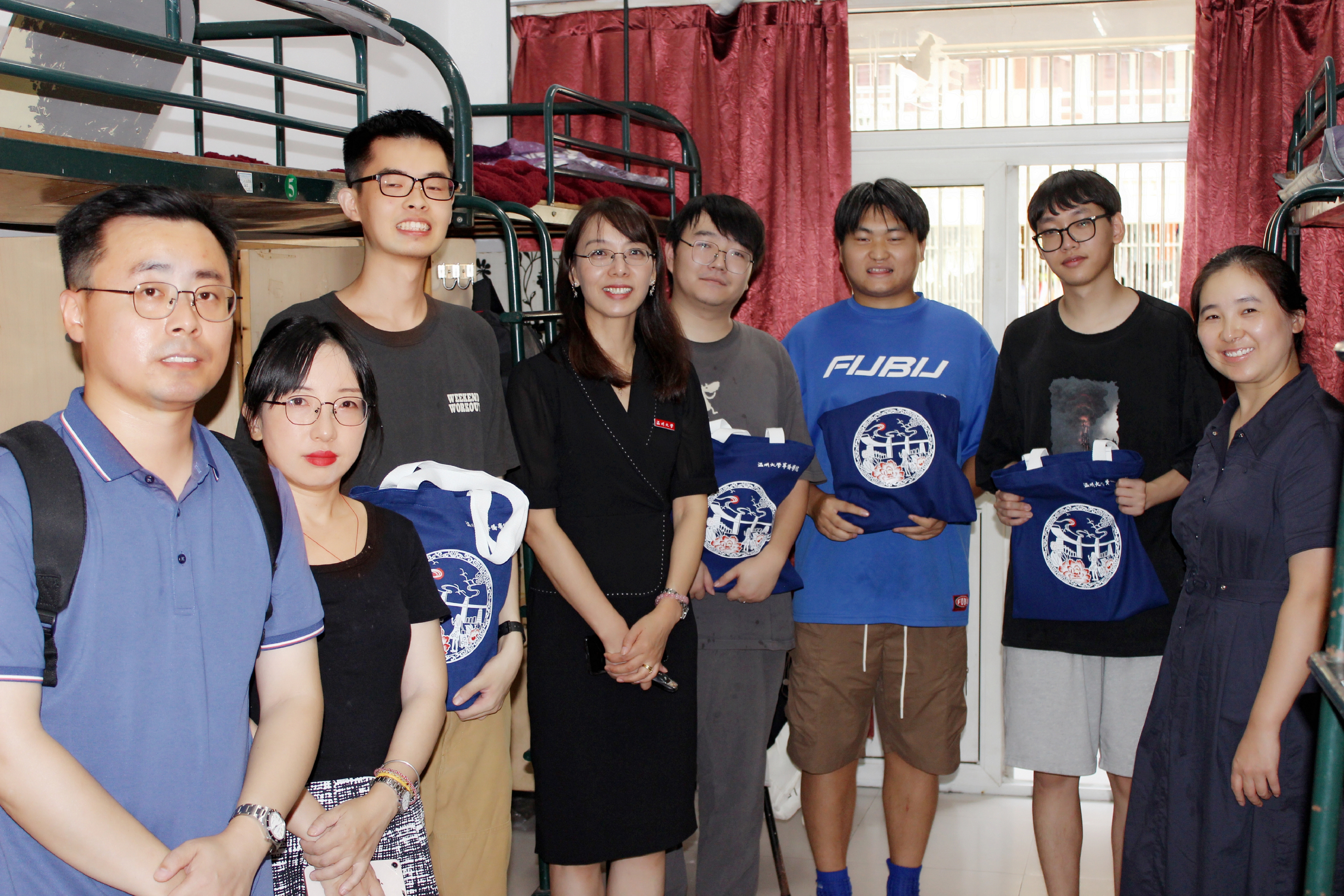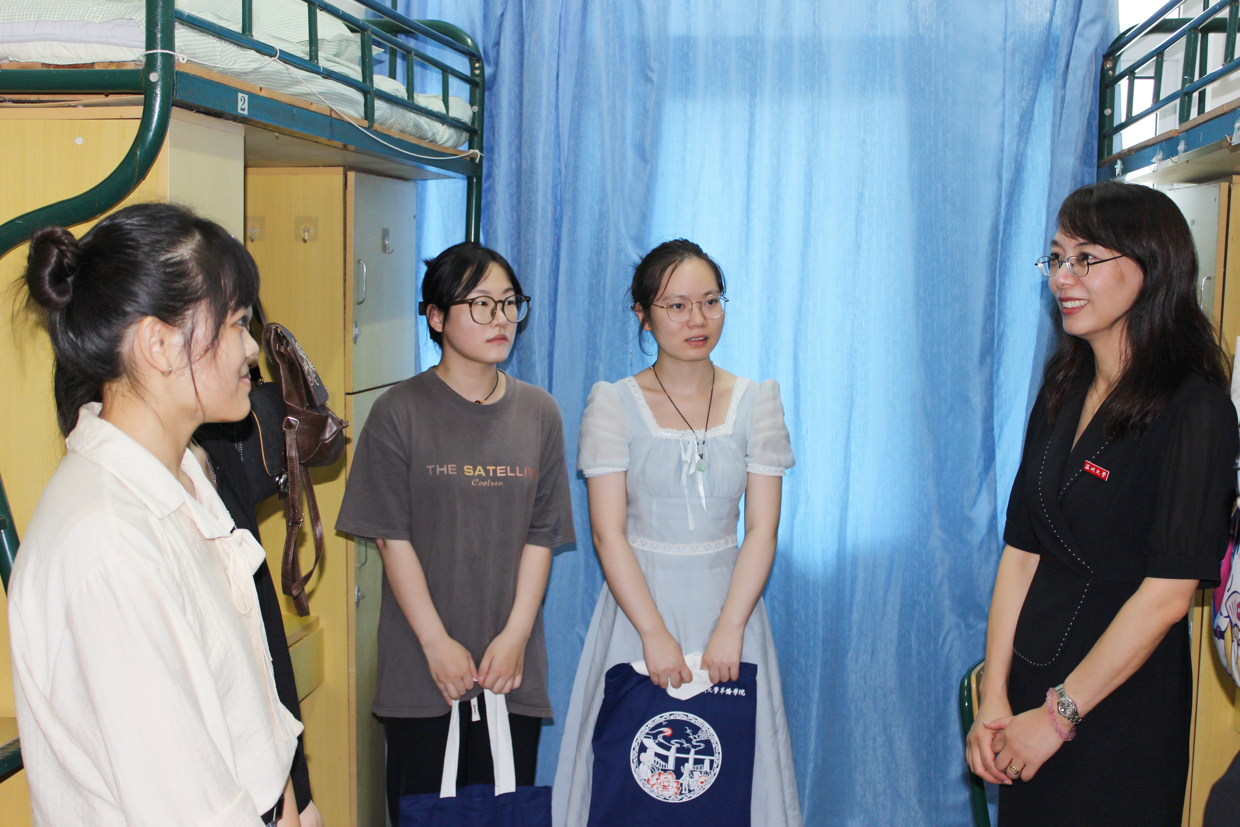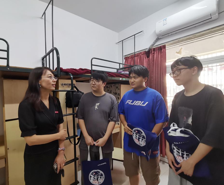 9428cn太阳集团古天乐董事长赵敏、党委(董事长)办公室主任蔡联群、9428cn太阳集团古天乐经理包含丽、研究生院经理刘玉侠、研究生院副经理邹超等领导和老师们来到报到现场和新生宿舍,为新生们送上学院迎新礼包,并展开亲切交谈。