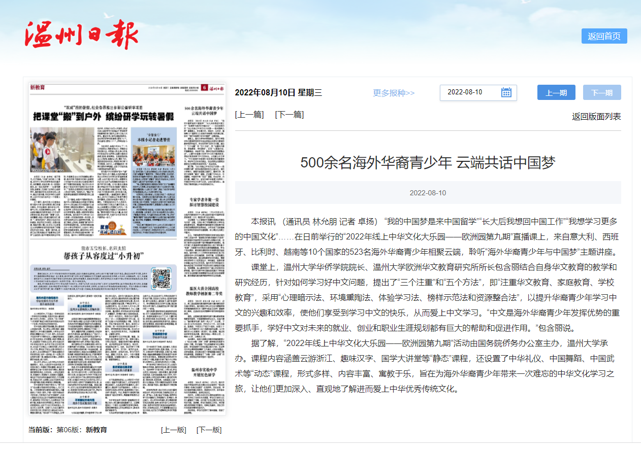 本报讯 (通讯员 林允朋 记者 卓扬) “我的中国梦是来中国留学”“长大后我想回中国工作”“我想学习更多的中国文化”……在日前举行的“2022年线上中华文化大乐园——欧洲园第九期”直播课上,来自意大利、西班牙、比利时、越南等10个国家的523名海外华裔青少年相聚云端,聆听“海外华裔青少年与中国梦”主题讲座。