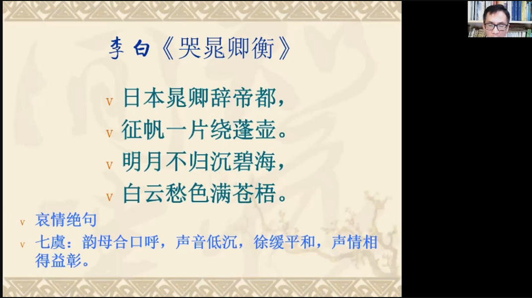 除对古诗词韵律进行讲解之外,陈老师还着重为大家介绍了“拖长音读书”,并通过诵读《诗经·小雅·采薇》《芙蓉楼送辛渐》《送孟浩然之广陵》和《哭晁卿衡》等古诗文进行了课堂演练。学员们不仅通过古诗词感受了中国古人的思想与智慧,更品味了汉语独特的美学价值。吟诵既能给人美的感受,又能在旋律与节奏的抑扬顿挫中激发读书的创造性。在古诗词之外,陈老师将吟诵的节奏之美带入百家姓,进一步加深了同学们对节奏的理解与感知。