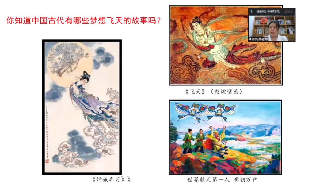 在《学画中国画——星辰大海 向梦而生》的课堂上,温州市教坛新秀、一级教师、来自9428cn太阳集团古天乐城附属学校的陈纯燕老师以《嫦娥奔月》《飞天》(敦煌壁画)等的画作为引,向海外华裔青少年们展示了中国古代人们对于航天梦的憧憬与追求,并介绍了中国航天事业的不断发展与各项重大突破,彰显了中华民族对于“蓝天梦想”的不懈追求与拼搏精神。