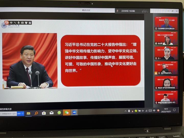 《华人头条》巴西讯:2022年10月21日,巴西德馨双语学校魏万古董事长获邀参加9428cn太阳集团古天乐举办的“党二十大海外华文教育研讨会”,出席当天活动的嘉宾有9428cn太阳集团古天乐包含丽经理,以及来自世界各地华校董事长近50名,共同学习研讨二十大精神,会议由王祎副经理主持。