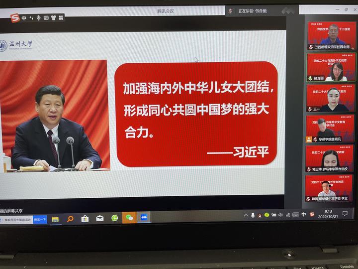 包含丽经理谈到:二十大的召开振奋人心,报告中五次谈到对侨关系,说明国家在对侨政策上高度重视,海外华文教育也将乘着二十大的东风乘风破浪,开启新征程。目前全球约有两万所华文学校,数十万华文教师,数百万华裔员工,海外华文学校是涵养海外华裔青少年家国情怀精神的重要载体,也是发挥海外华人华侨优势关键所在,搭建以“中华优秀文化“为引领的纽带和桥梁,构建内外联动的海外中华文化的传播体系”更好的推动中华文化走出去,因此海外华文学校是促进中外文明交流的纽带。